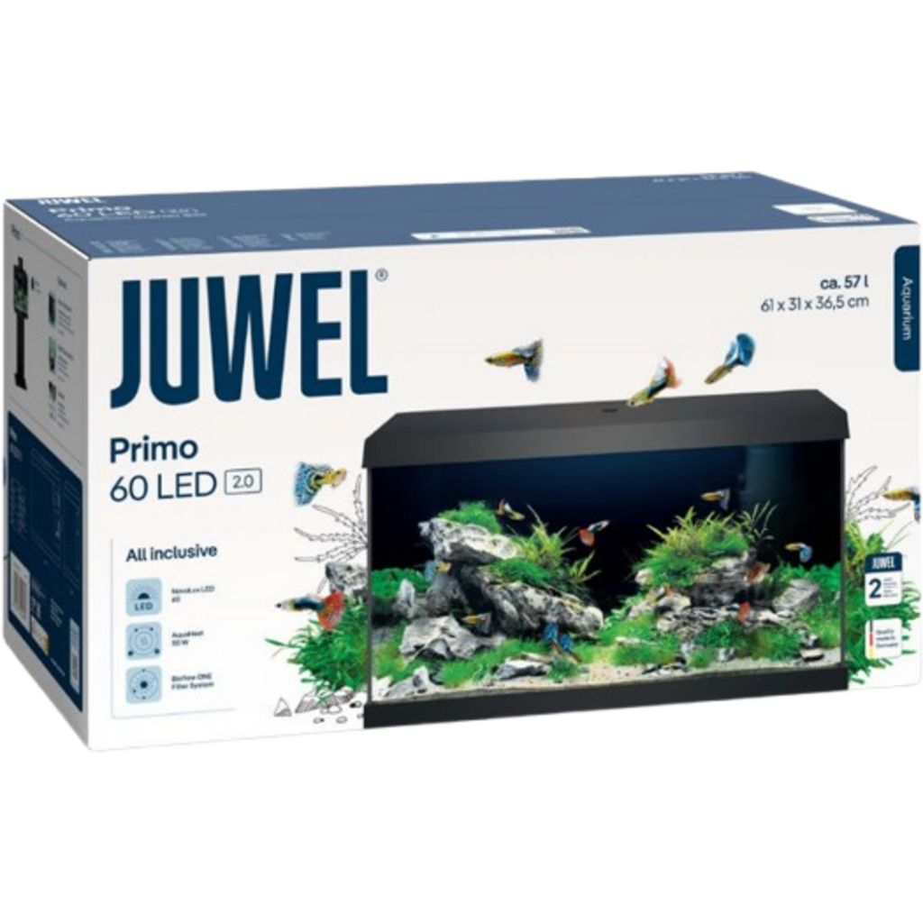 The Primo 60 2.0 LED Aquarium Set by Juwel is the perfect entry-level model with top technology for beginners. It includes modern LED lighting and an efficient filtration system. The set is carefully made with high-quality materials and includes perfectly coordinated technology – the safety frame ensures a secure placement without the need for special supports. Described below are the most important features of the various components in the set:
